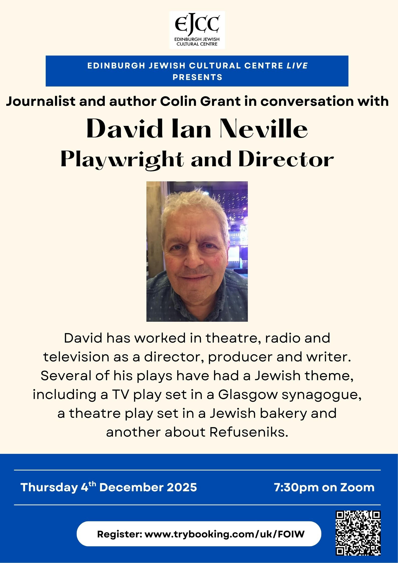 Journalist and author Colin Grant will be in conversation with playwright and director David Ian Neville. David has worked in theatre, radio and television as a director, producer and writer. Several of his plays have had a Jewish theme, including a TV play set in a Glasgow synagogue, a theatre play set in a Jewish bakery and another about Refuseniks.