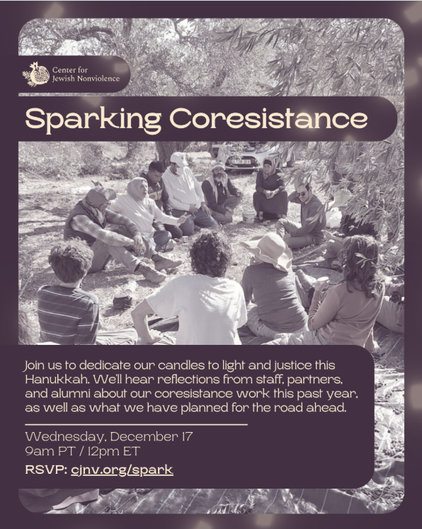 Join us for Hanukkah to dedicate our candles to light and justice during these dark times. We’ll hear stories and reflections from CJNV staff, partners, and alumni about the state of on-the-ground Jewish-Palestinian coresistance, as well as what we have planned for the road ahead in 2026. If you have a chanukia, we encourage you to light candles with us.