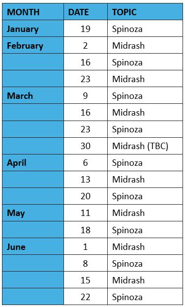 Participants may attend all sessions or only those on Spinoza or Midrash. No prior knowledge is necessary, but in the Midrash sessions participants who wish to will have the opportunity to read the Hebrew/Aramaic text.